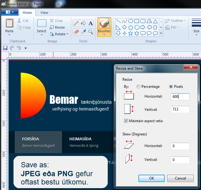 Til að tryggja að myndir séu í lagi þurfa þeir sem nota WordPress vefumsjónarkerfi að minnka sínar myndir áður en þær eru settar á vefinn, WordPress er ekki með myndaforrit sem sér um þetta þó þú getir sett myndina í réttastærð á síðuna þá er hún samt eins stór og þung í vinnslu og þú settir hana inn. Það er mjög auðvelt að minnka myndir með forritum sem eru á nánast öllum vélum eins og td. Paint. Smellt er á Resize og Pixels valið þá getur í sett inn td. 600 í Horizontal og smellt á OK, ef þú vilt líka eiga myndina í upphaflegri stærð velur þú Save As (JPEG eða PNG gefa oftast bestu útkomu) og gefur nýrri mynda stærð nýtt nafn.